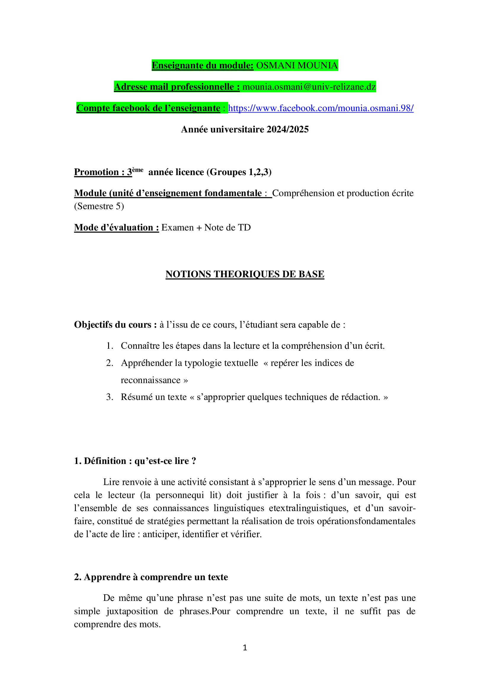 COURS COMPREHENSION ET PRODUCTION ECRITE 1 3LMD (S5)